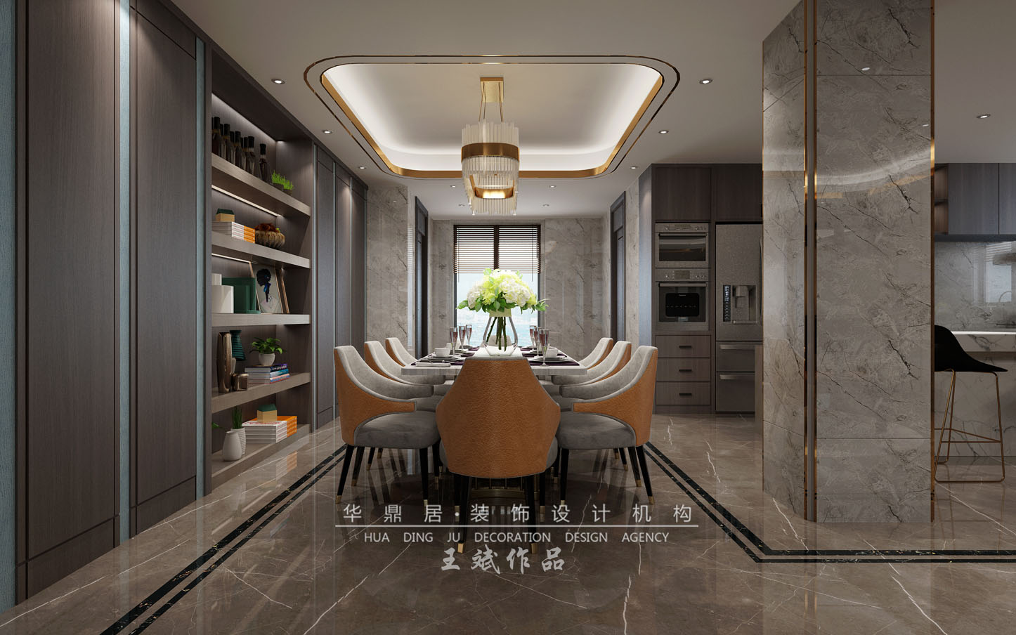 主要建材:大理石瓷砖、玫瑰金线条,爱马仕橙硬包、影木墙板爵士白大理石、进口人字拼木地板等