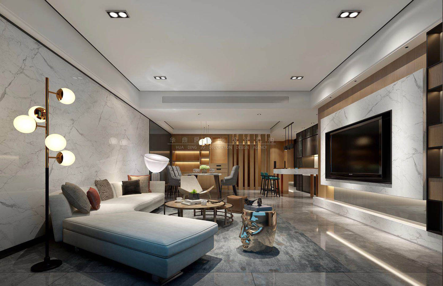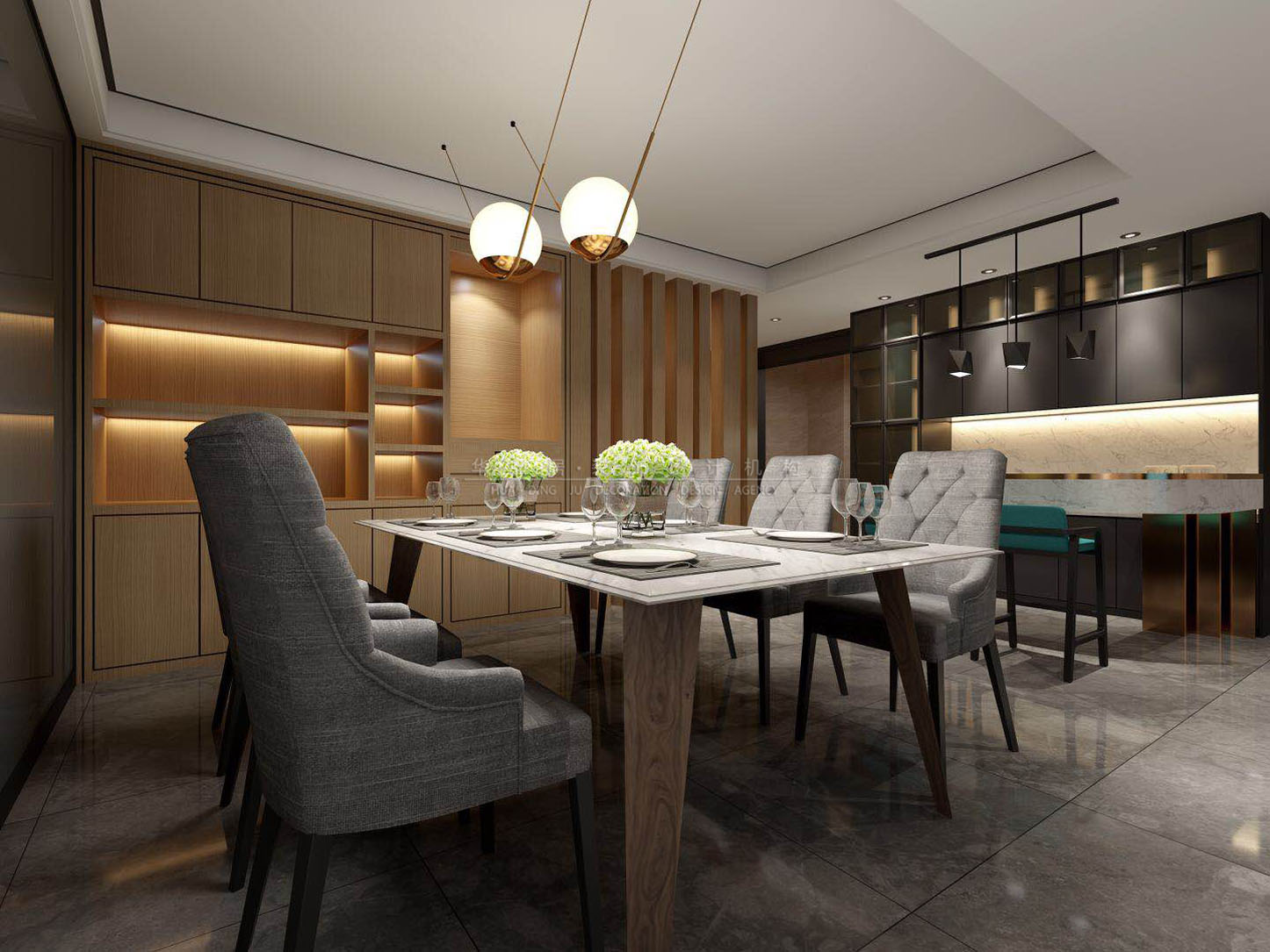 主要建材:爵士白大理石瓷砖、黑灰通体砖,黑钛边框等