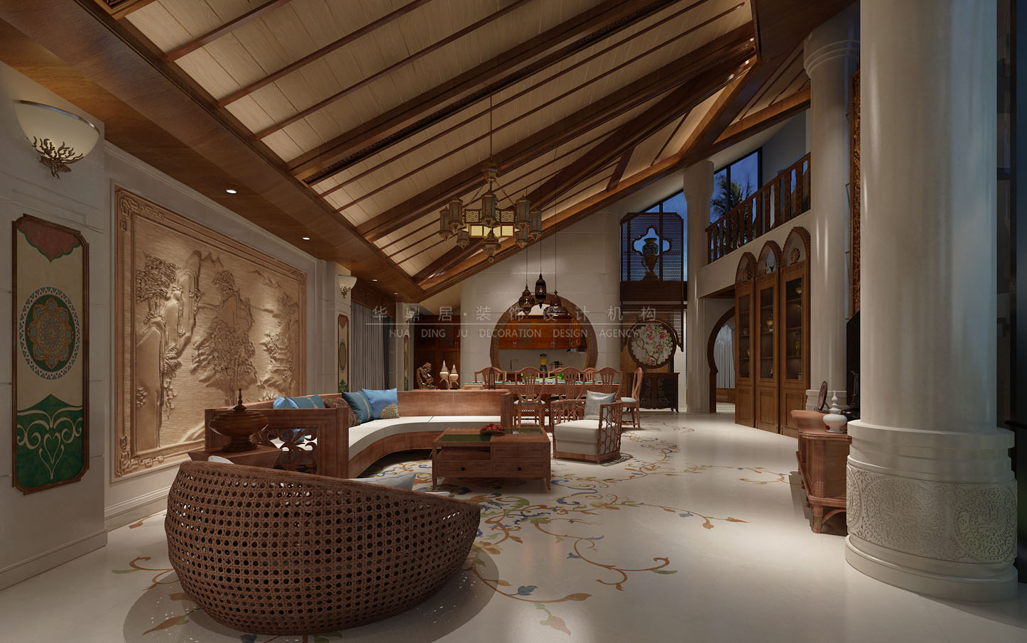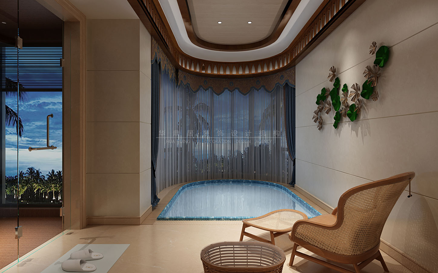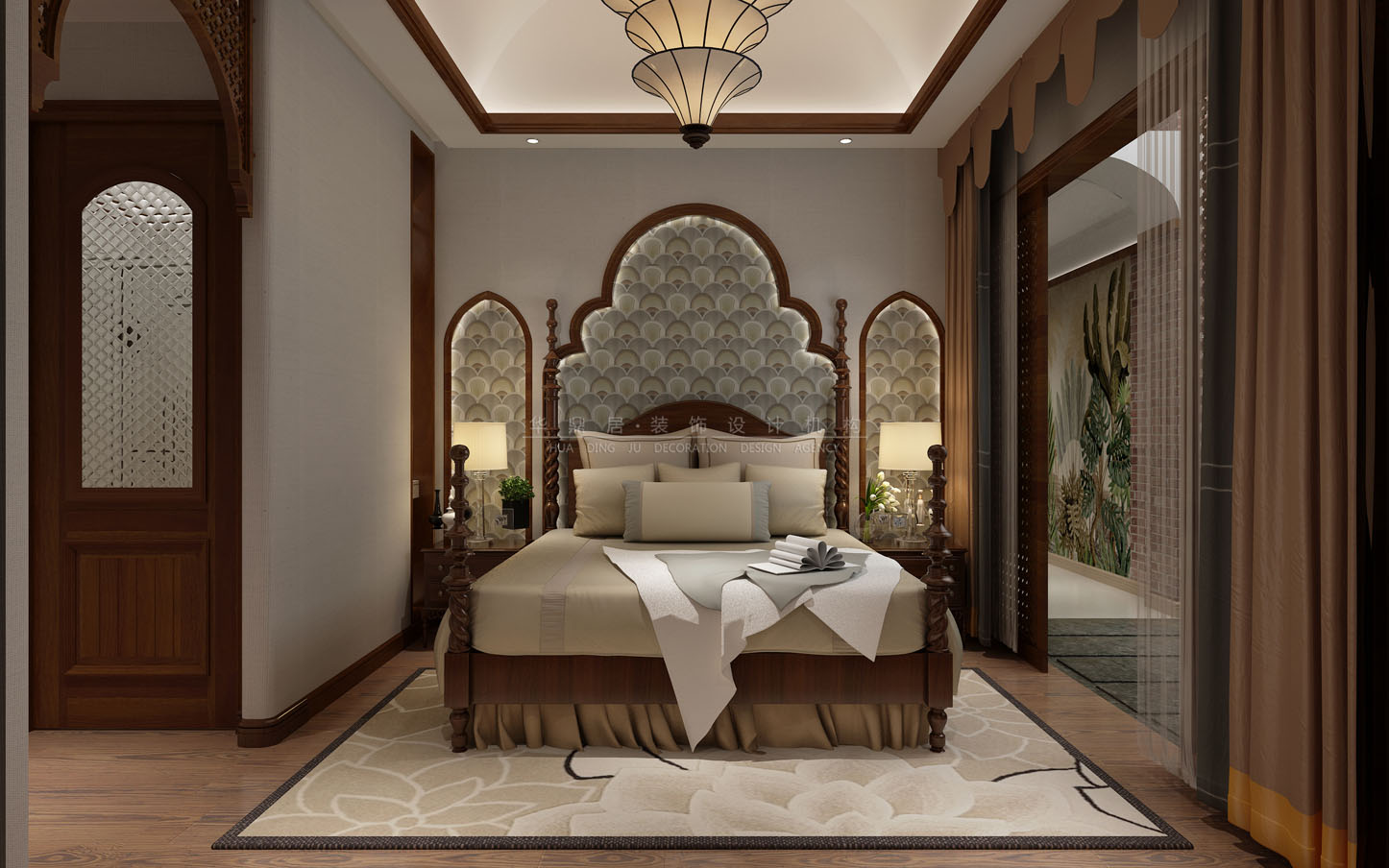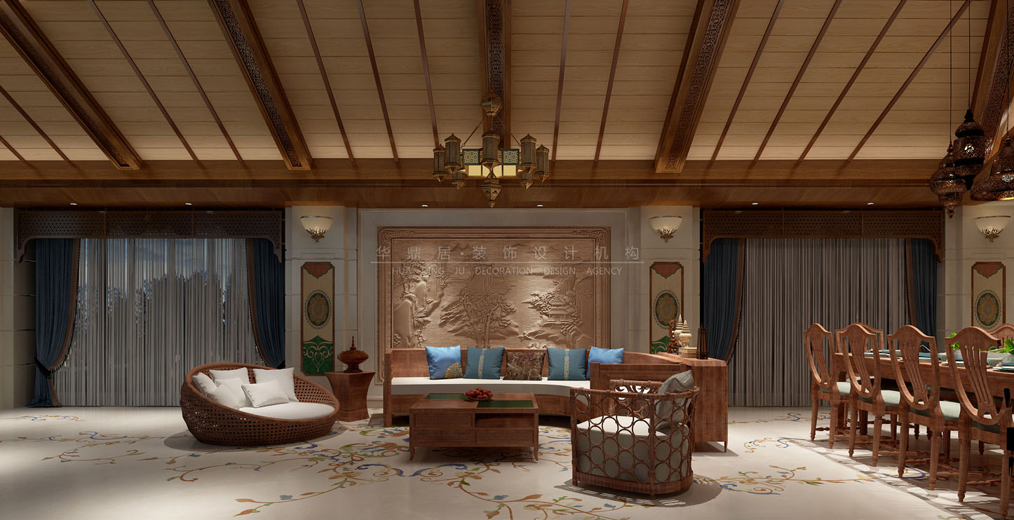 设计说明:结合了东南亚民族岛屿特色及精致文化品位的家居设计方式,多适宜喜欢静谧与雅致、奔放与脱俗的装修为主,运用木材和其他的天然原材料,如藤条、竹子、石材、青铜和黄铜,深木色的家具,局部采用一些金色的壁纸、丝绸质感的布料,灯光的变化体现了稳重及豪华感。