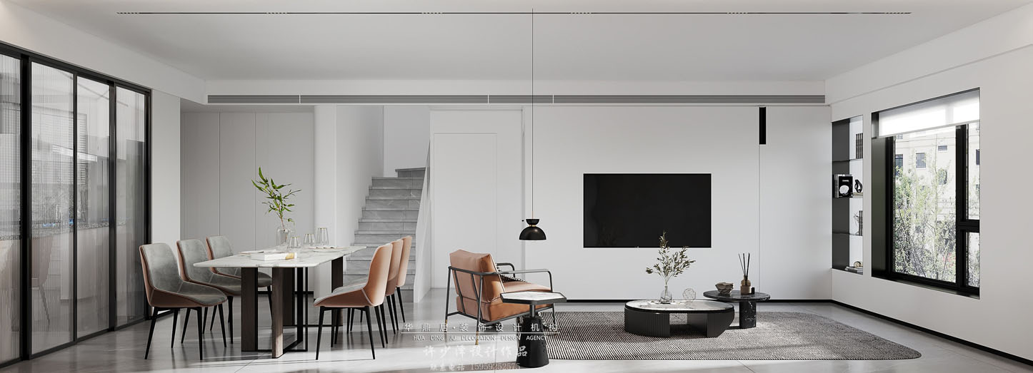 设计说明:以留白诠释丰富、将风格让位于舒适,立面赋以白色平铺墙面,玄武黑电视在局部穿插。一层的配置着重点在开放。除卧室、卫生间和厨房之外,运用全开放式设计公共空间,流畅的动线、充足的玻璃窗邀请透亮的光感入室,并采用白色的墙面/柜体分色处理,协调空间整体的比重,延展空间的尺度。