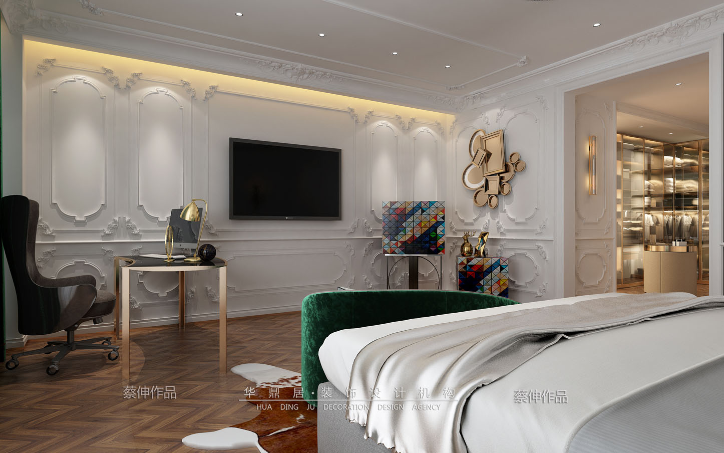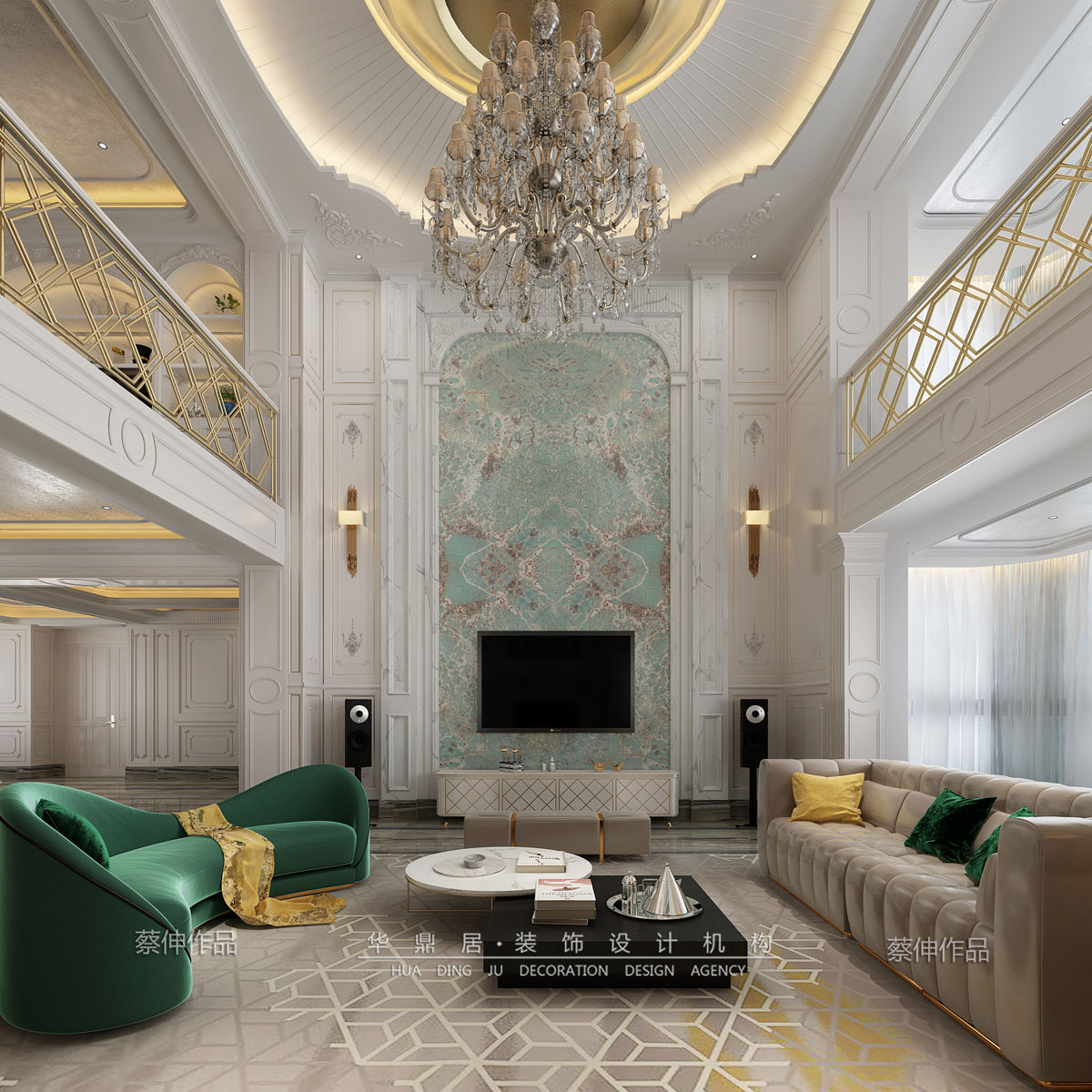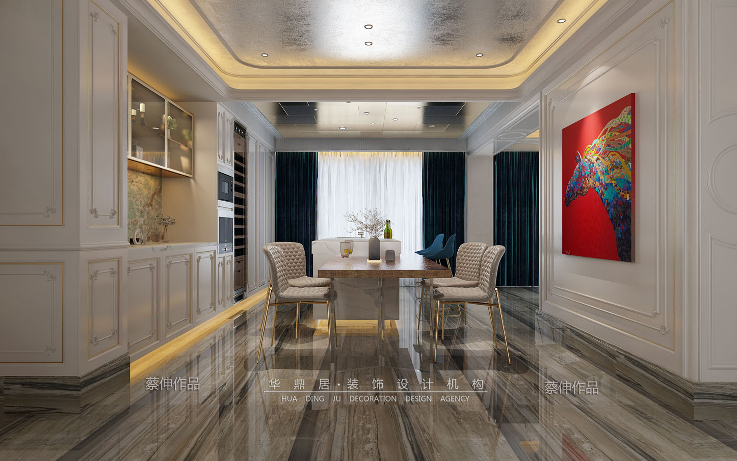 设计说明:本案为法式轻奢风格,客厅精选静谧典雅白,高贵金为主色调,形成淡雅与尊贵的视觉冲击。摒弃传统法式的繁复冗杂,淡雅的空间色调结合几何线条,打造出一个法式轻奢主义的空间。本案设计师摒弃传统法式洛可可中的繁复、冗杂的装饰造型与甜腻的色泽,转而在通透方正的空间格局中,用经典轴线、对称布局的方式,既承袭了最具法国特色的优雅、浪漫,同时让空间更为轻盈、时尚与现代,从而贴近了时下业主对品质生活与潮流新风尚的理解。