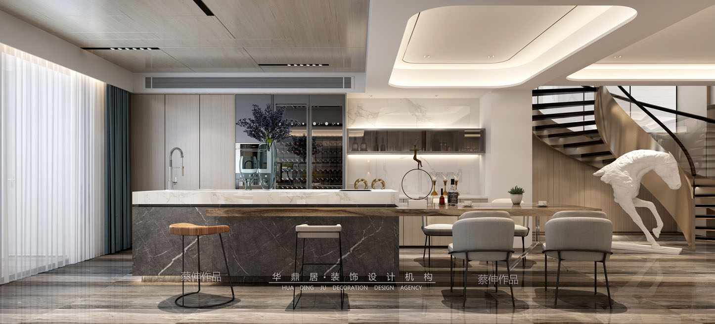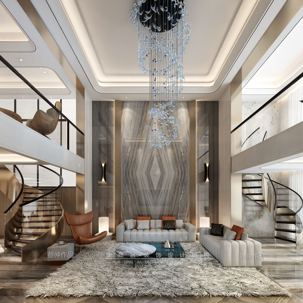 设计说明:设计师把生活与艺术置于空间,以绅士的设计手法创造奢华品味共存,让业主看到物质生活与艺术品味的完美结合。本案以现代轻奢的设计手法,将简约大气、雅致内敛表现的淋漓尽致。 客厅的挑空格局加上现代轻奢风格的设计,尽显空间感,充满质感的蓝金沙,与线性家具的立体感互相呼应,现代轻奢的生活空间便从此开始。