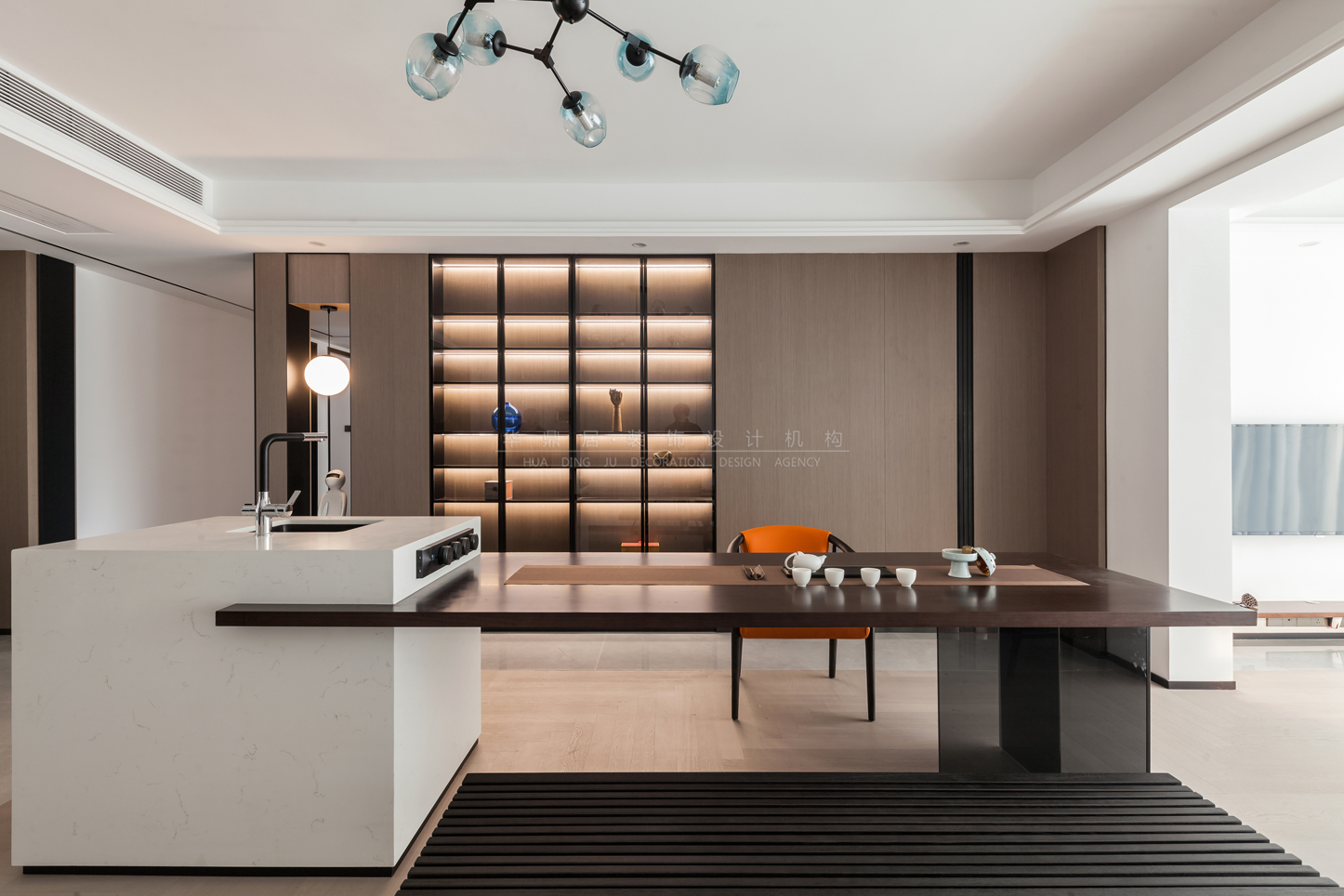 设计说明:本案以打造现代轻奢+意式极简的浪漫主义为主调,设计将原有格局餐厅公卫进行了大胆改动,原有公卫墙体拆除,扩大餐厅区域,使得客餐厅通透联动,尽显大宅风范。结合业主待客需求,客厅突破传统,将岛台及泡茶桌相结合,沙发电视观影区移动至阳台区,既有品茗闲谈亦有休闲娱乐专属空间