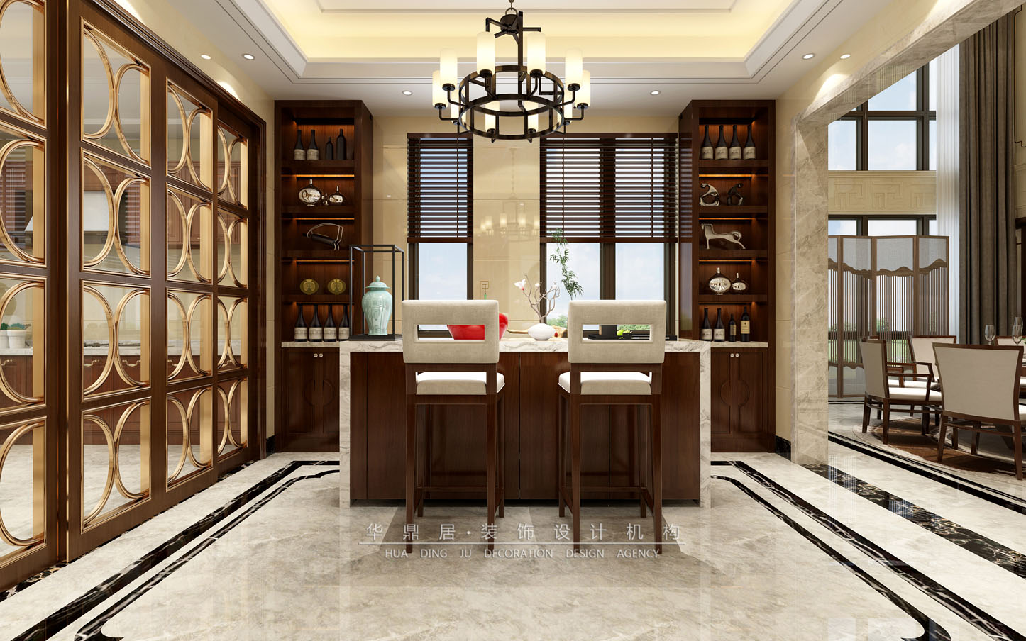 设计说明:本案设计讲究空间的层次感,在需要隔绝视线的地方,使用中式的屏风或窗棂、中式木门、工艺隔断、简约化的中式“博古架”,通过这种新的分隔方式,展现出中式家居的层次之美。再以一些简约的造型为基础,添加了中式元素,使整体空间感觉更加丰富,大而不空、厚而不重,有格调又不显压抑。