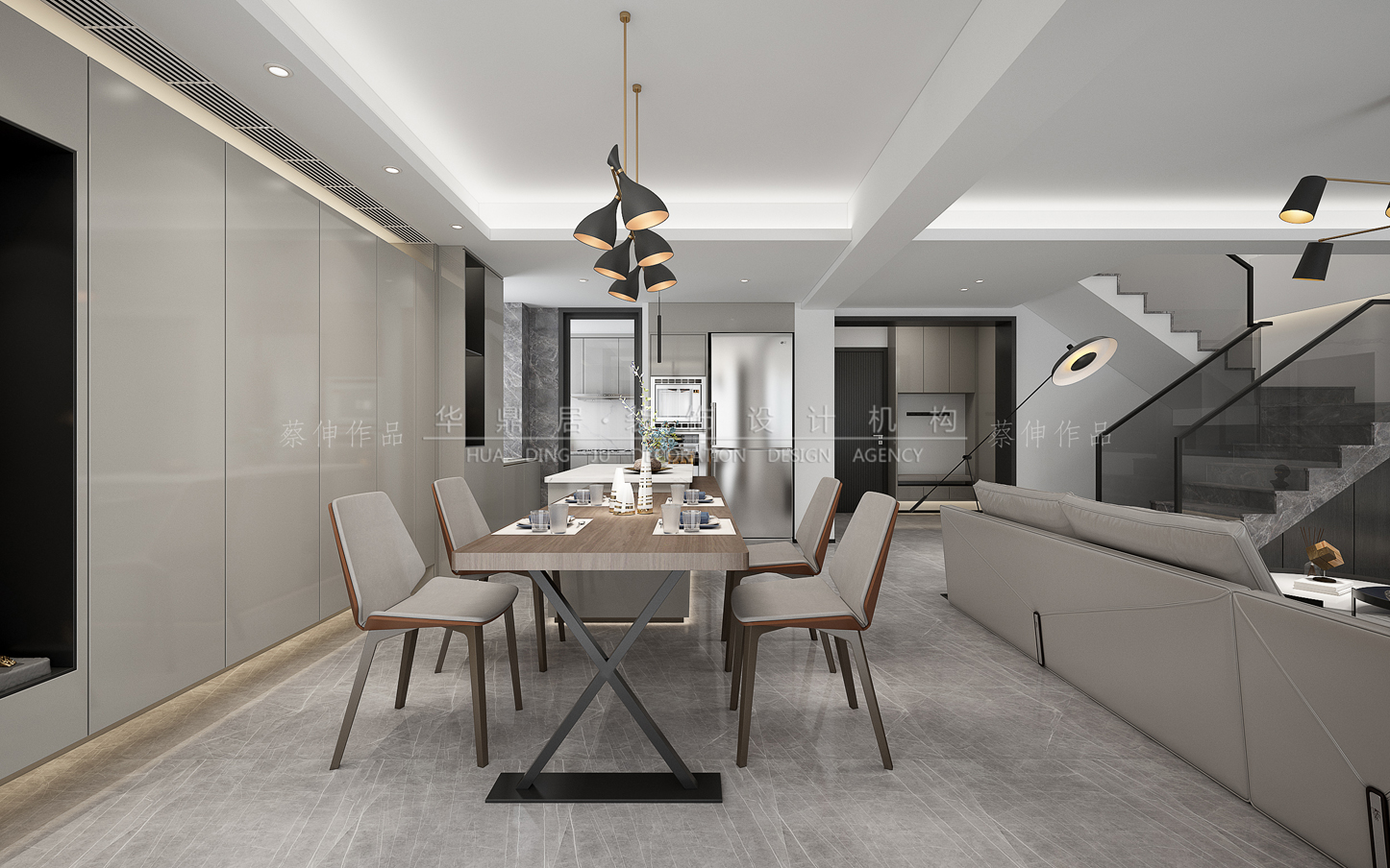 主要建材:卡斯拉原木、白色系与灰色系大理石瓷砖与岩板、乳胶漆、不锈钢等