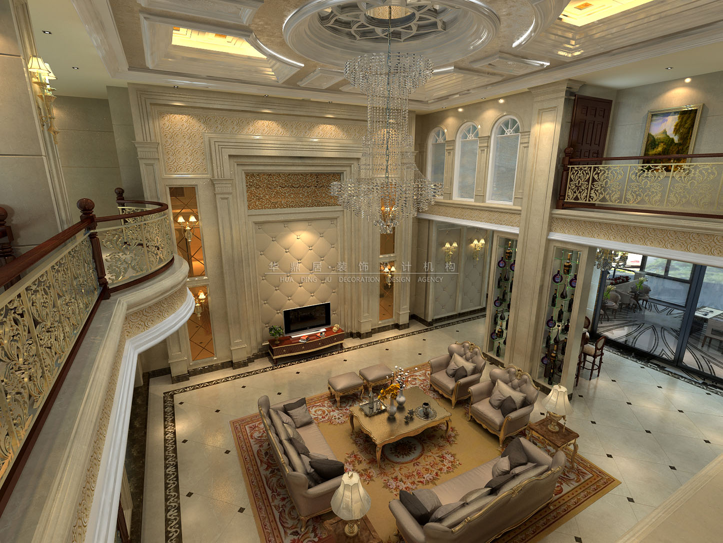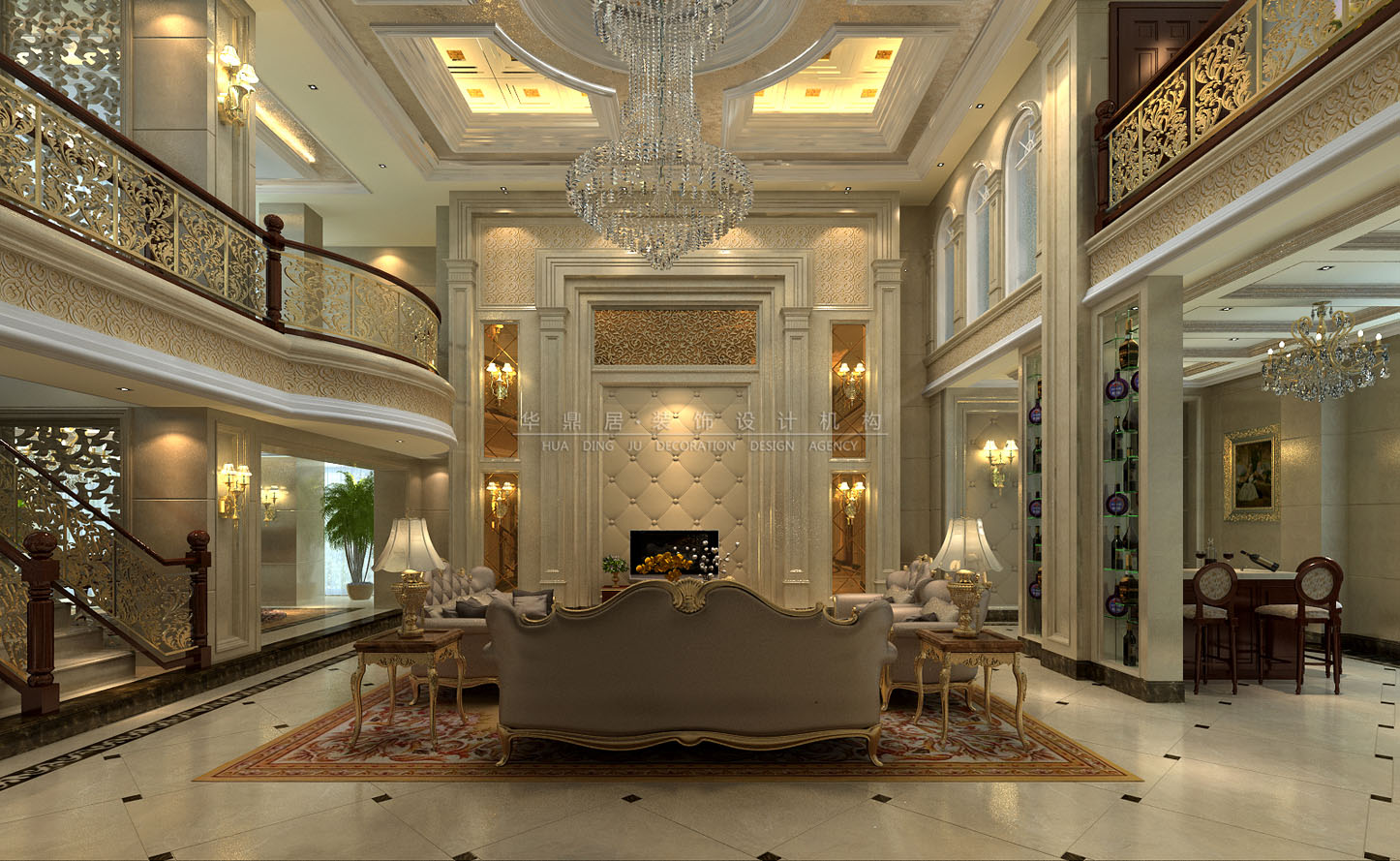 设计说明:本案设计师通过独到的设计,将欧式风格演绎成一种优雅的平衡姿态。含蓄、考究的家具,亦不乏令人踏实的温厚之感。客厅拥有挑高的结构,体现了居室的尊贵奢华之感,华丽的水晶吊灯营造气氛,门窗成圆弧形,并用欧式独有的花纹石膏角线勾边,局部的银镜饰面使空间更加有深度。设计师注重对软装陈设的展示,墙面装饰多以精美的松香玉、精细的实木拼花、柔美的艺术涂料、复古帷幔式的窗帘相搭配,构成了室内庄重豪华的气氛。整栋别墅空间,结合主人的生活习惯以及不俗的生活品味,打造了一个精彩的欧式风格的设计案例。