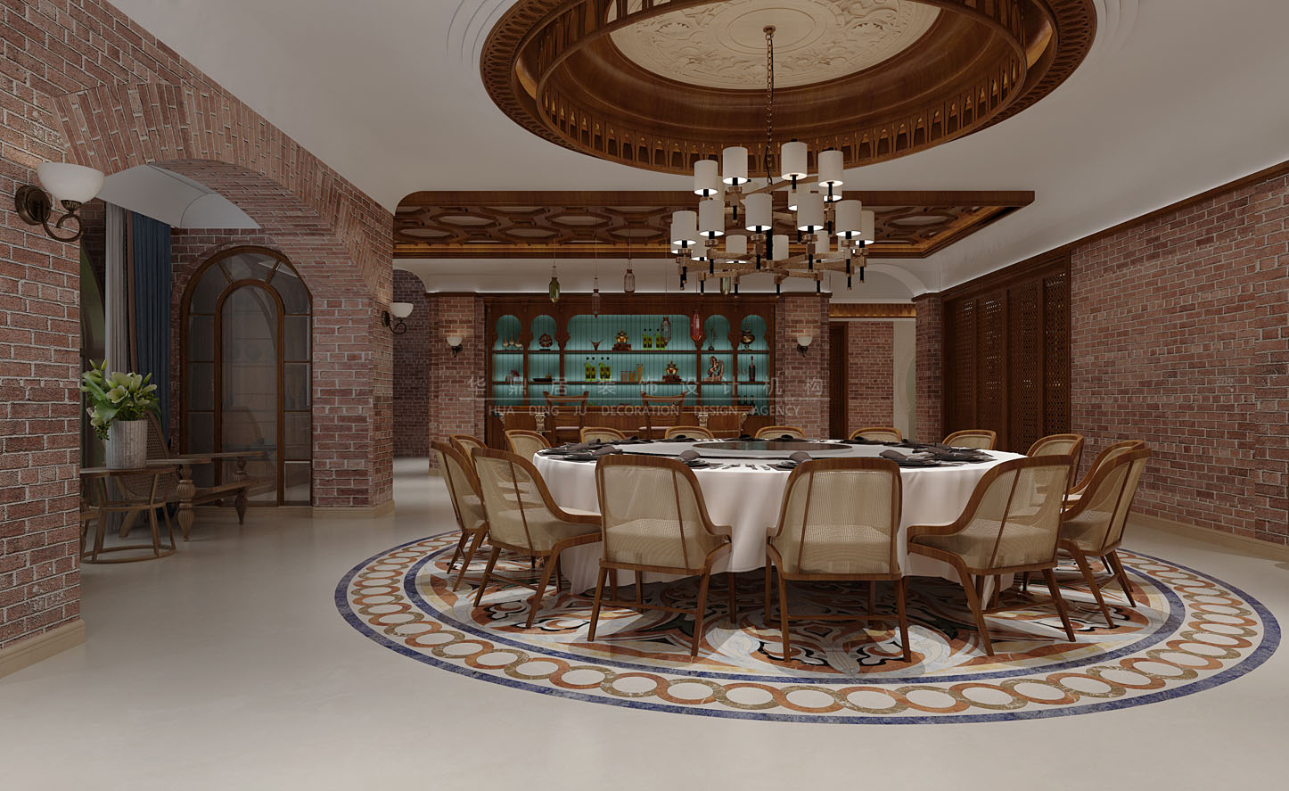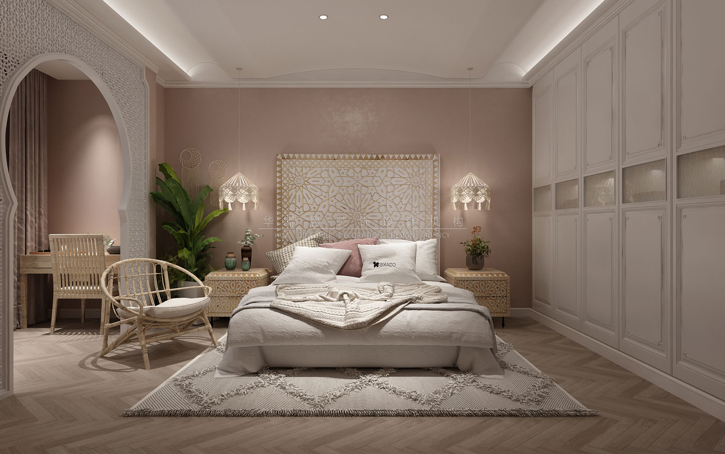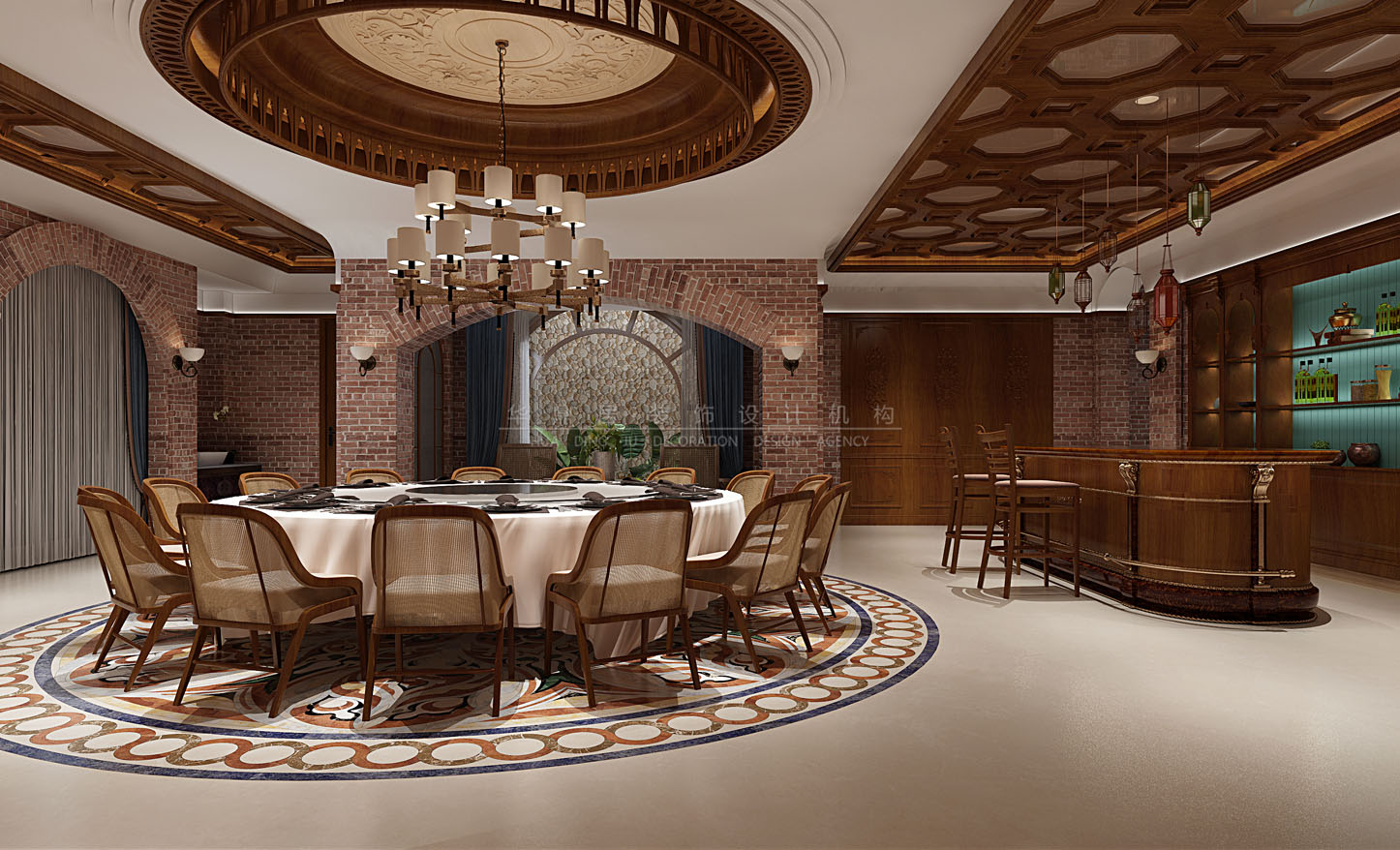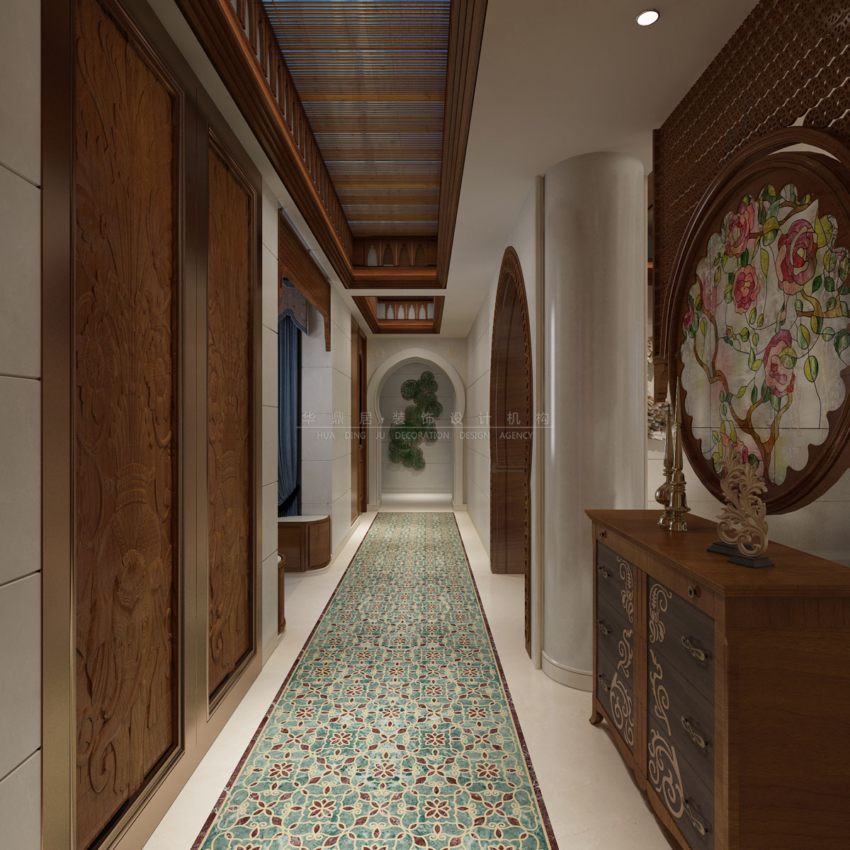 设计说明:结合了东南亚民族岛屿特色及精致文化品位的家居设计方式,多适宜喜欢静谧与雅致、奔放与脱俗的装修为主,运用木材和其他的天然原材料,如藤条、竹子、石材、青铜和黄铜,深木色的家具,局部采用一些金色的壁纸、丝绸质感的布料,灯光的变化体现了稳重及豪华感。