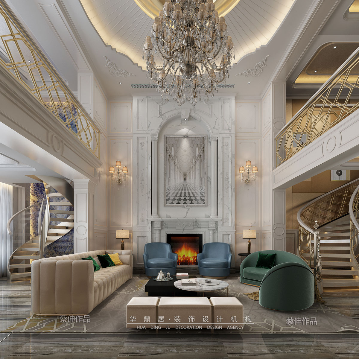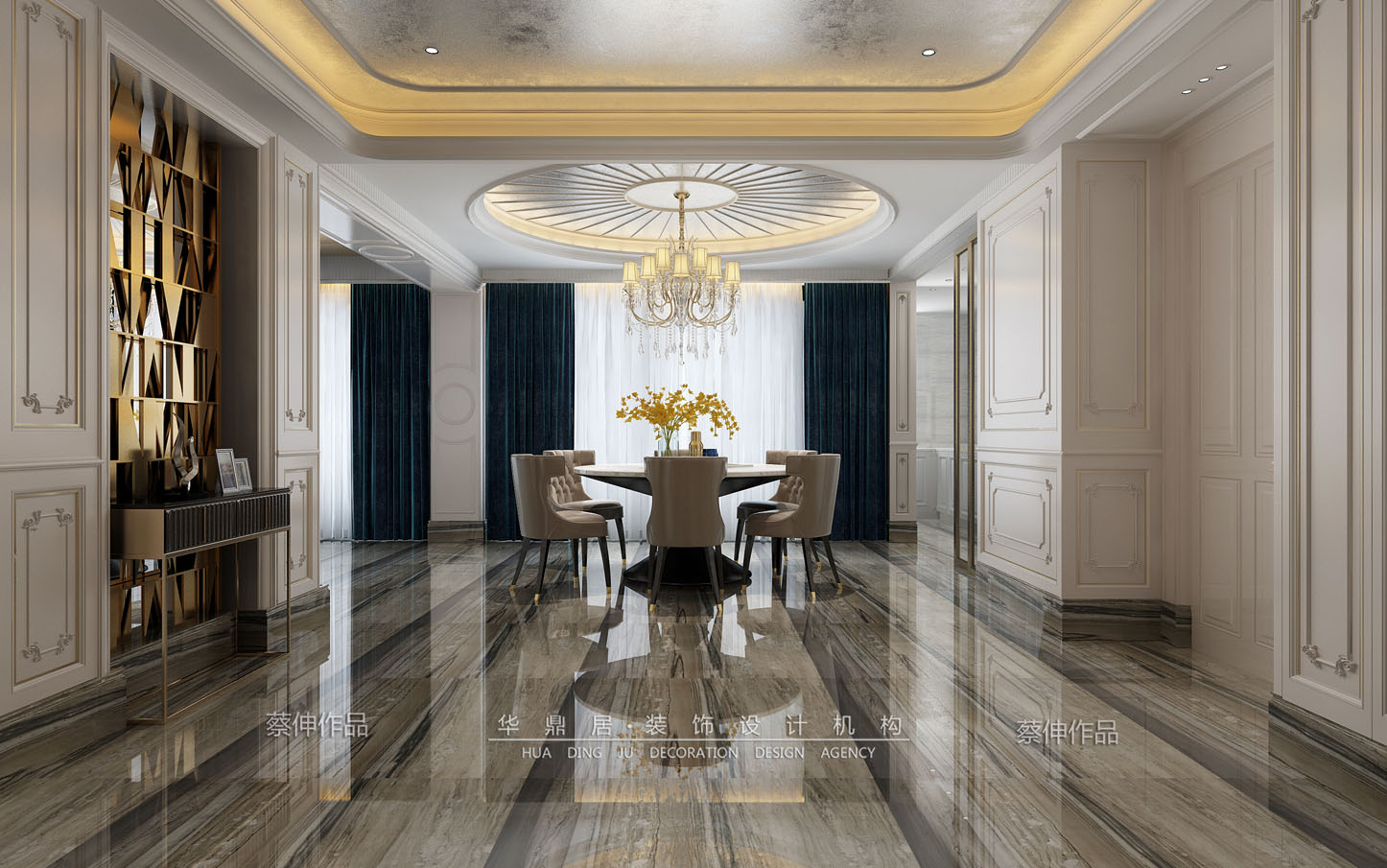 设计说明:本案为法式轻奢风格,客厅精选静谧典雅白,高贵金为主色调,形成淡雅与尊贵的视觉冲击。摒弃传统法式的繁复冗杂,淡雅的空间色调结合几何线条,打造出一个法式轻奢主义的空间。本案设计师摒弃传统法式洛可可中的繁复、冗杂的装饰造型与甜腻的色泽,转而在通透方正的空间格局中,用经典轴线、对称布局的方式,既承袭了最具法国特色的优雅、浪漫,同时让空间更为轻盈、时尚与现代,从而贴近了时下业主对品质生活与潮流新风尚的理解。
