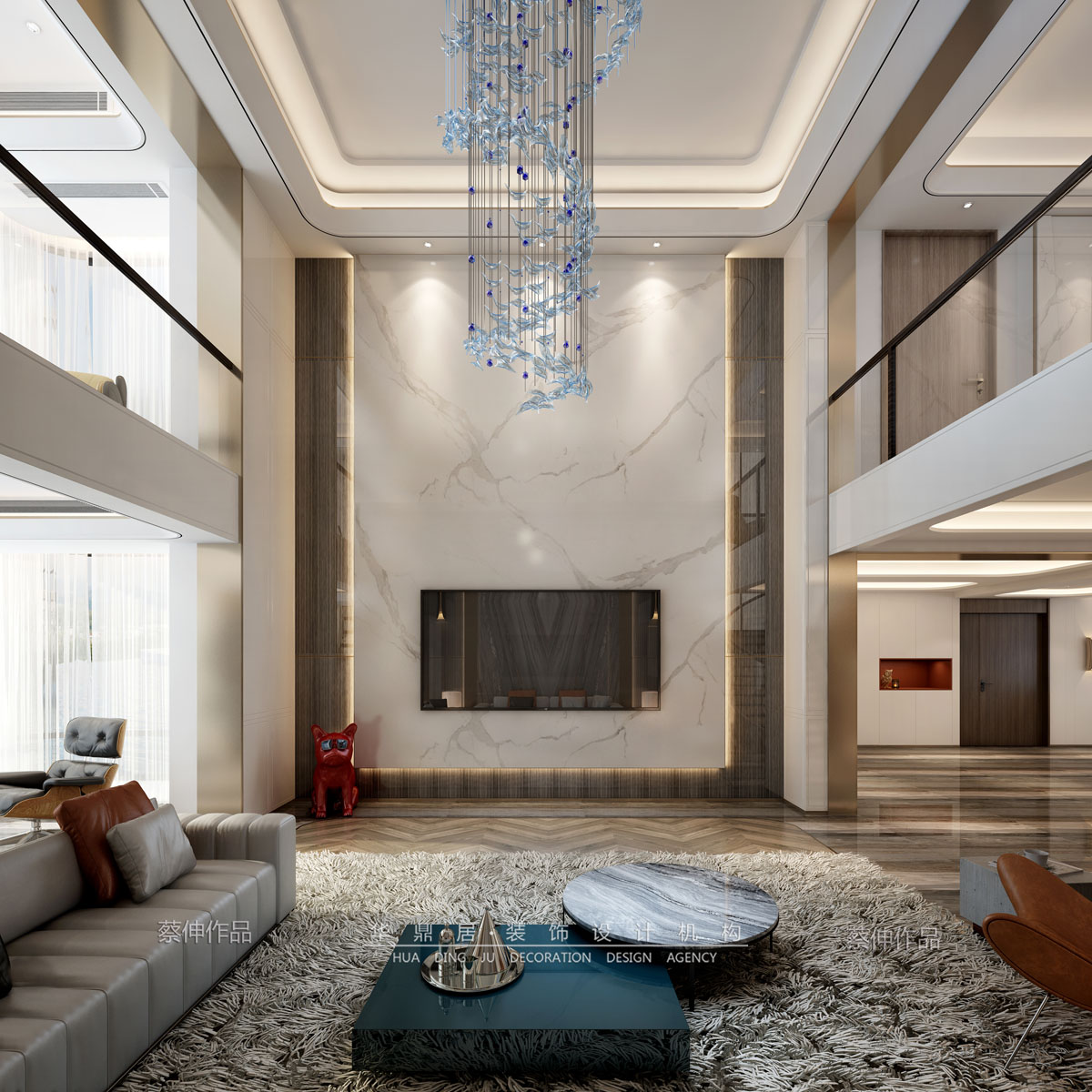 设计说明:设计师把生活与艺术置于空间,以绅士的设计手法创造奢华品味共存,让业主看到物质生活与艺术品味的完美结合。本案以现代轻奢的设计手法,将简约大气、雅致内敛表现的淋漓尽致。 客厅的挑空格局加上现代轻奢风格的设计,尽显空间感,充满质感的蓝金沙,与线性家具的立体感互相呼应,现代轻奢的生活空间便从此开始。