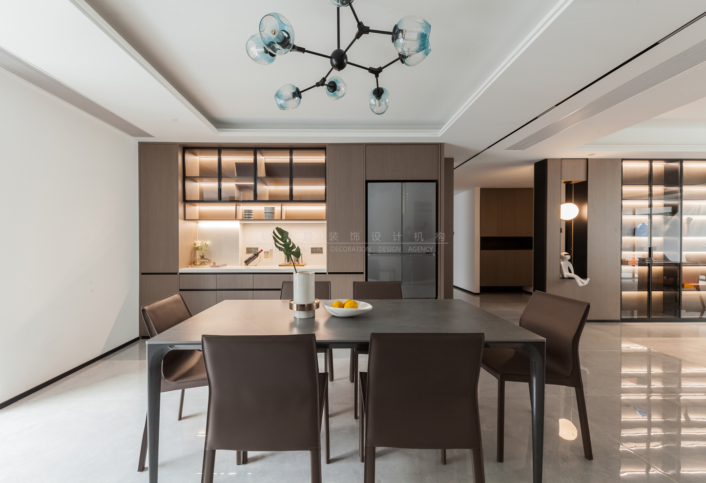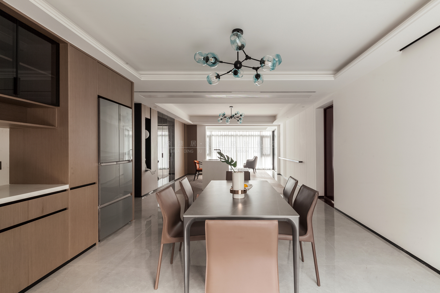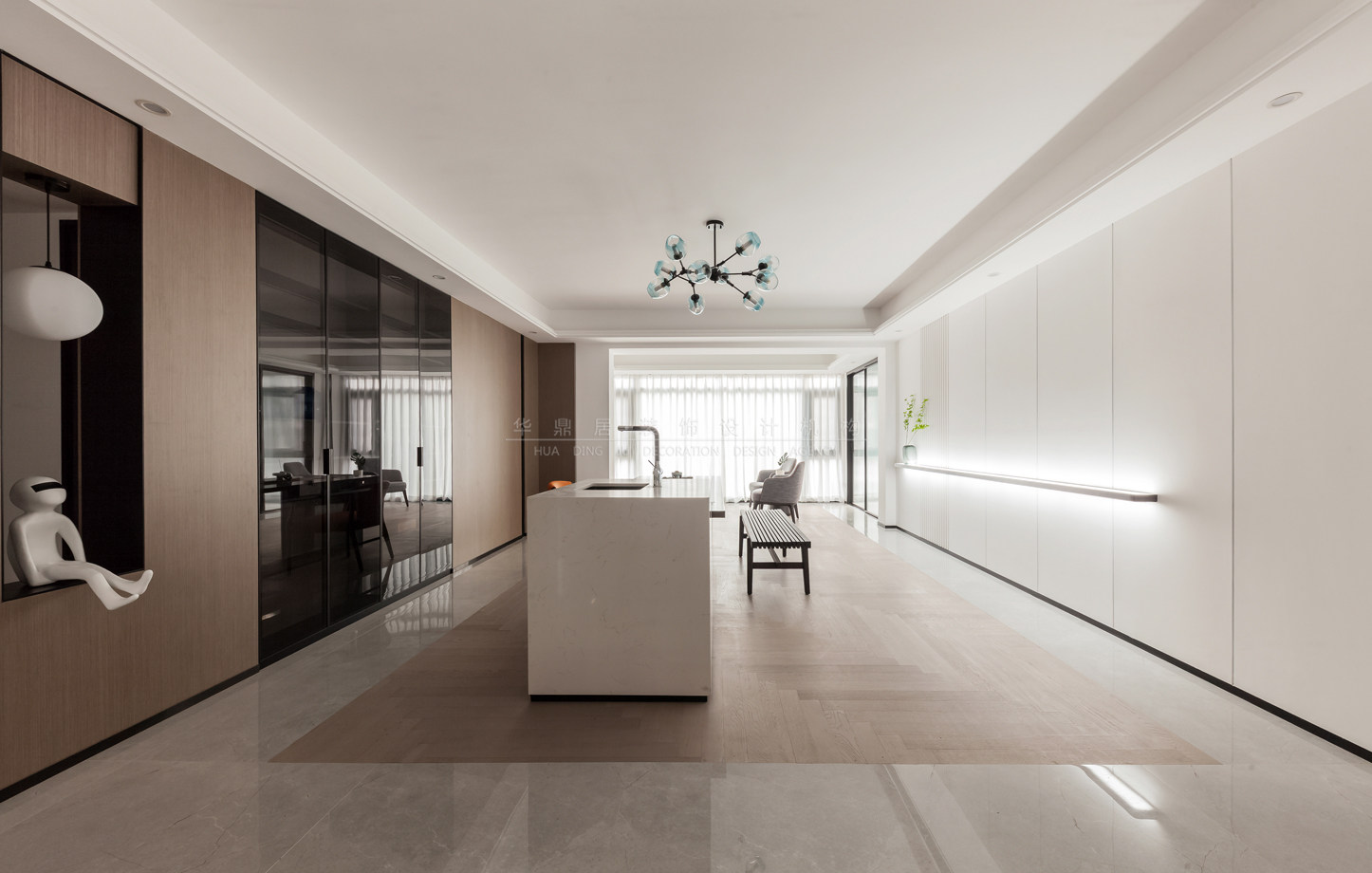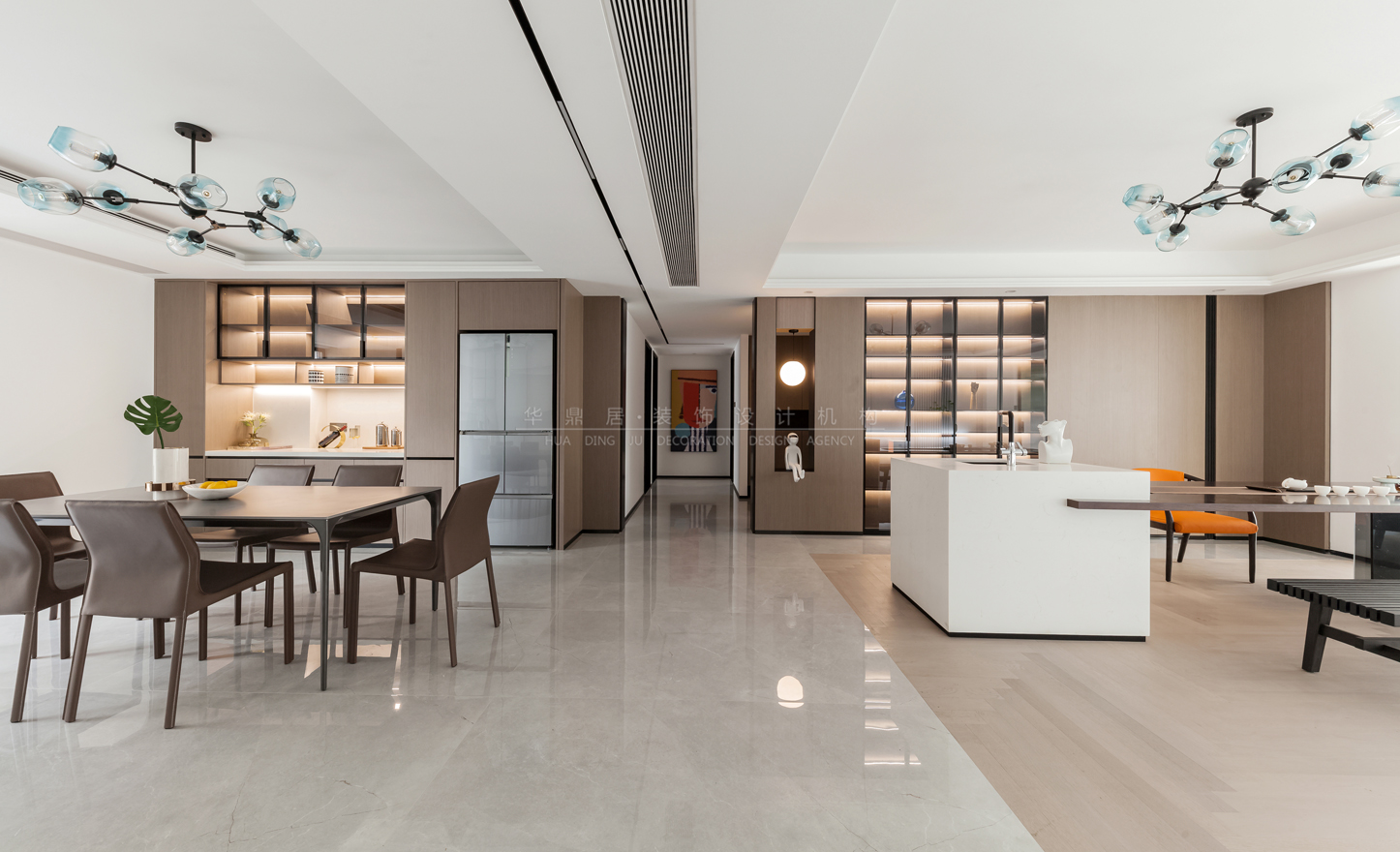 设计说明:本案以打造现代轻奢+意式极简的浪漫主义为主调,设计将原有格局餐厅公卫进行了大胆改动,原有公卫墙体拆除,扩大餐厅区域,使得客餐厅通透联动,尽显大宅风范。结合业主待客需求,客厅突破传统,将岛台及泡茶桌相结合,沙发电视观影区移动至阳台区,既有品茗闲谈亦有休闲娱乐专属空间