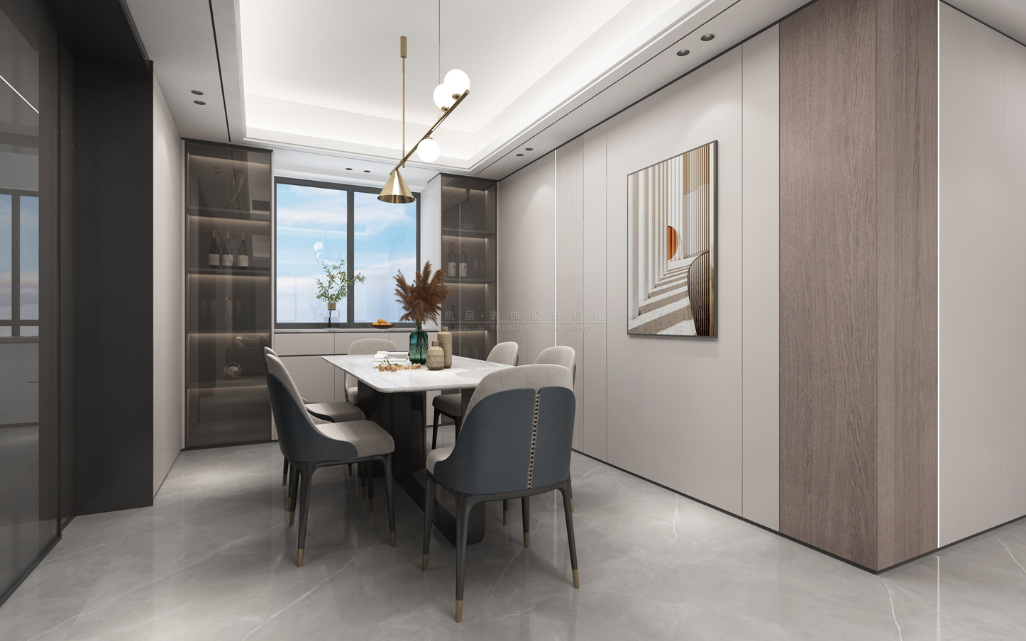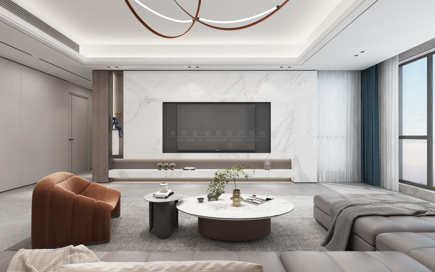 主要建材:灰纹大板砖、奶油灰护墙板、爵士白石材电视背景等